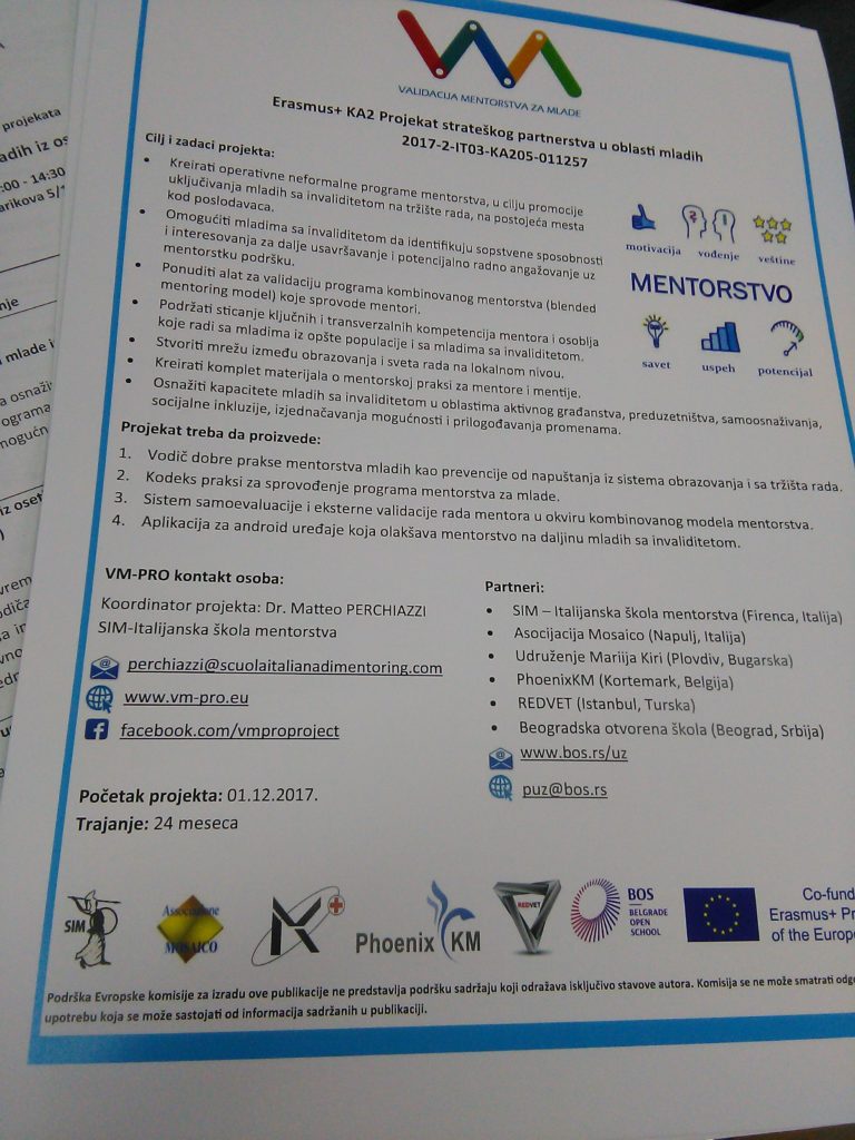 Sastanak je otpočeo predstavljanjem projekta VM-pro: Validacija mentorstva za mlade. Pored predstavljanja osnovnih podataka o projektu, posebna pažnja posvećena je predstavljanju Vodiča za sprovođenje mentorstva za mlade koji je kreiran u okviru projekta. Diskutovalo se o inovativnim (operativnim i refleksivnim) alatima u mentorstvu koje je razvila Italijanska škola mentorstva – nosilac projekta i ekspert u oblasti, kao i mogućnostima za primenu iste u mentorskom radu u Srbiji. Posebno interesovanje vladalo je za mogućnost primene onlajn mentorstva na daljinu kao značajnog segmenta za olakšavajući i efikasniji rad sa mentijima. U završnom delu sesije najavljeni su dalji koraci u projektu koji se odnose na realizaciju šestomesečnog programa mentorstva za mlade iz osetljivih grupa.